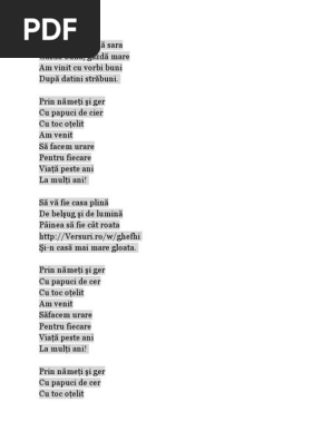 Prin nămeți și ger. Bună vremi bună sara gazdă bună gazdă mare am vinit cu vorbi buni după datini străbuni. Bună vremi bună sara gazdă bună gazdă mare am vinit cu vorbi buni după datini străbuni. Prin nămeţi şi ger.