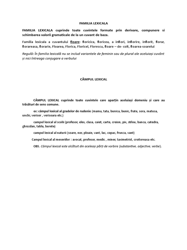 Fisa Elevului Clase Lexicale Camp Lexical Familie Lexicala
